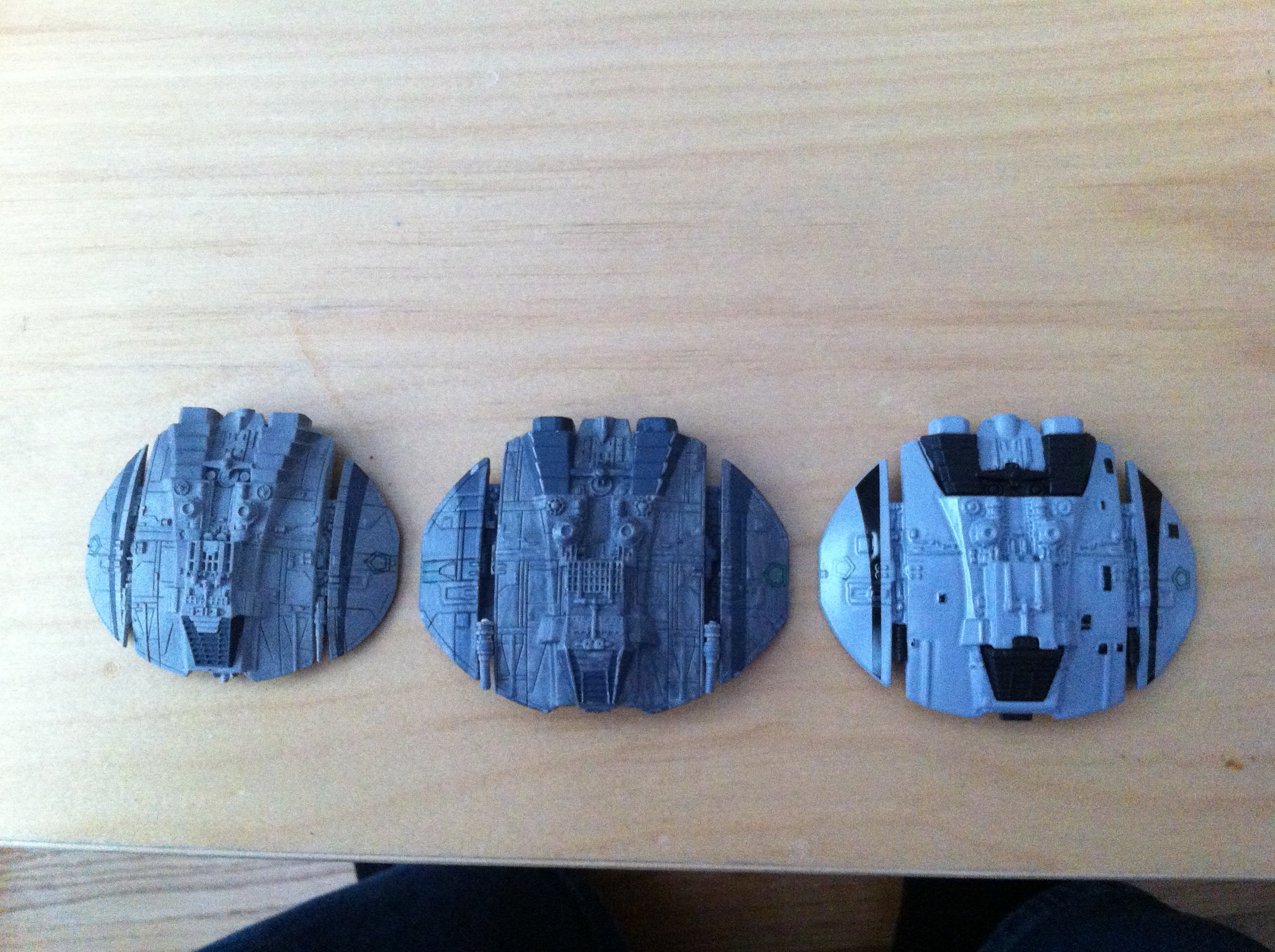 Battlestar Galactica Cylon Raider Miniature Comparison Posted by Brent on 23 October 2013, 9:14 pm Here are a couple of shots that shows the Konami Raider, the Titanium Raider from Hasbro and the new Hot Wheels Raider. The Konami Raider is slightly smaller than the other two, which are almost identical in size