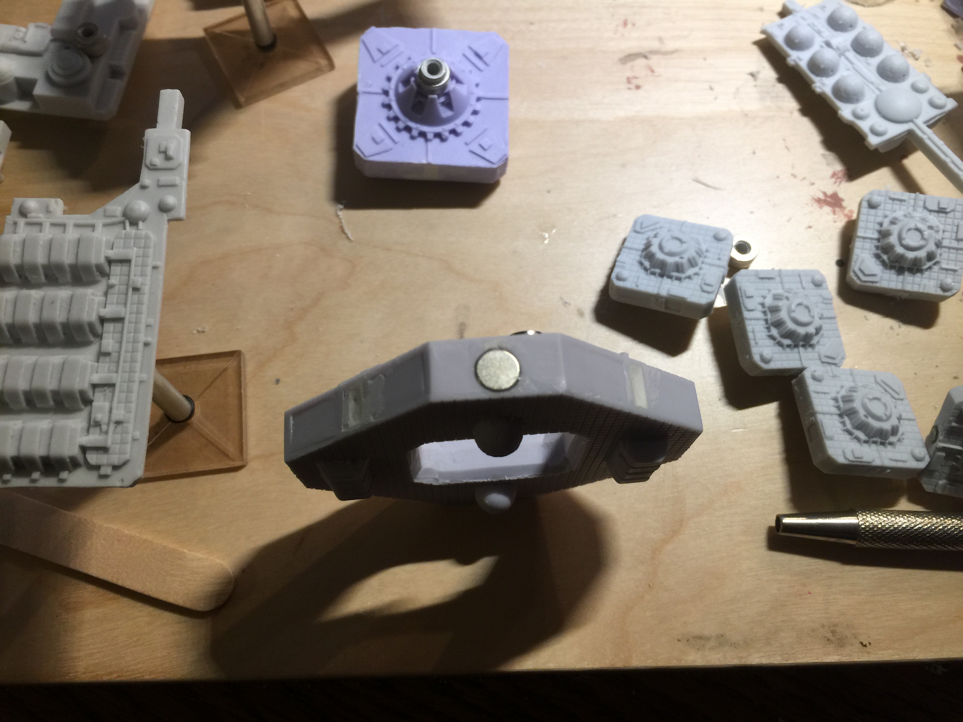 Some small magnets on some of the smaller parts, much neater by this point. Also being careful to align the poles of the magnets so they would attract and not repel to the magnets on the big hup. I drilled out the domes a little and went with washers for them instead of magnets.